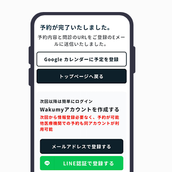 予約を取りやすくするために、2025年5月13日以降の診療予約は「Wakumy」という新しいWEB予約システムをご利用いただく事になりました。はじめて受診される方は、同システムより予約を取得した上で受診をお願いいたします。